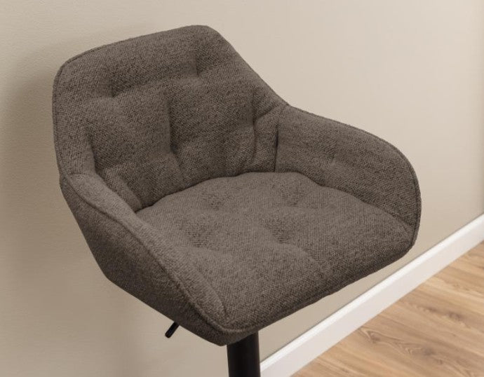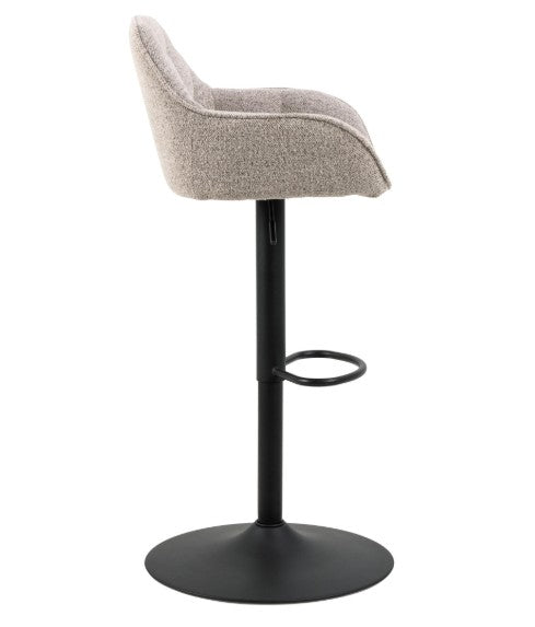 Brooke bar stool in fabric on a trumpet base matt black rough powder coated steel with footrest, gas lift, swivel and tuftings.
