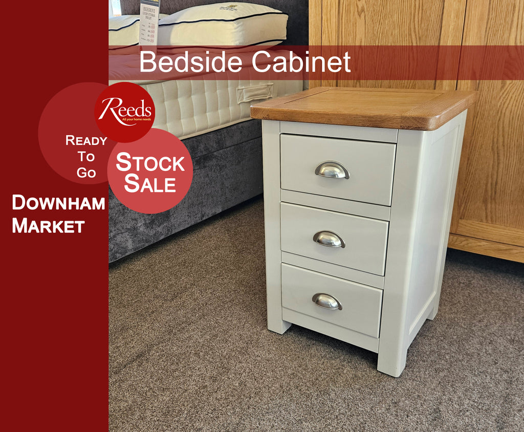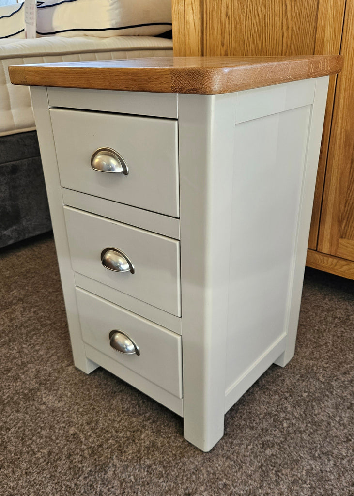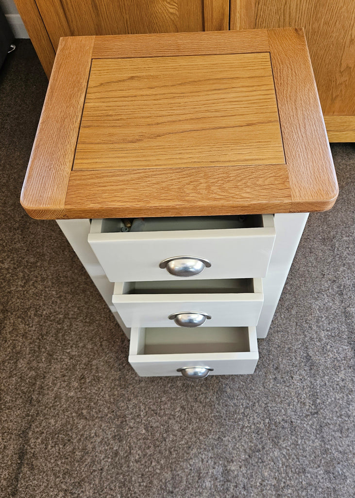 This beautiful collection of furniture will look beautiful in both a traditional or contemporary home. The 3 Drawer Bedside cabinet has an Oak Top and Painted Stone Body with Satin Chrome Handles.