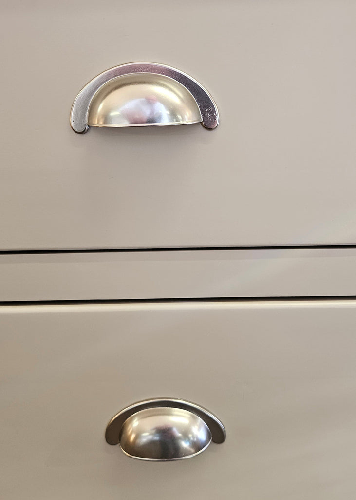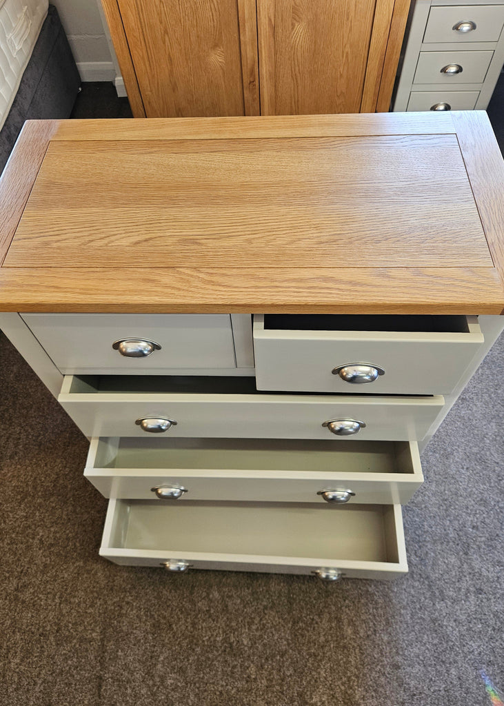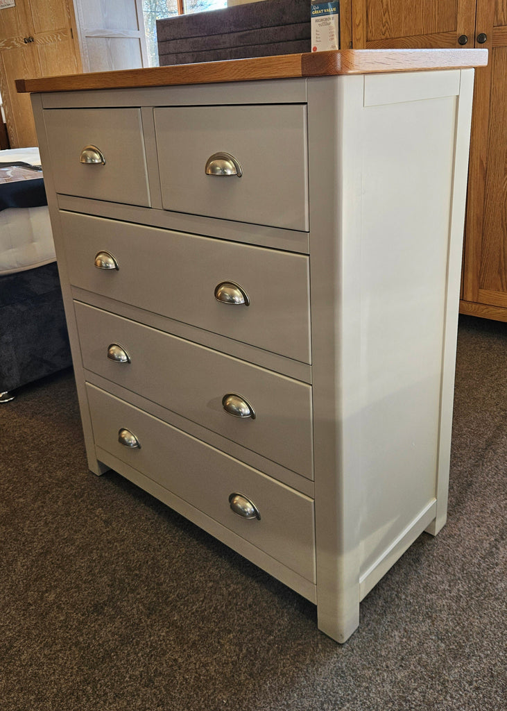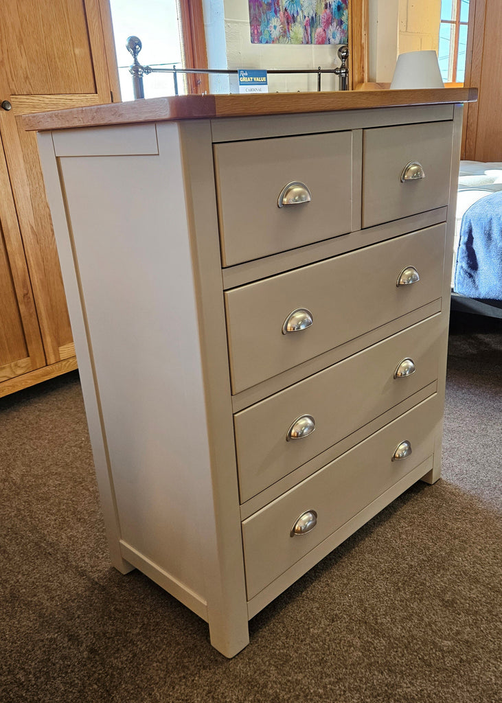 This beautiful collection of furniture will look beautiful in both a traditional or contemporary home. The 2 Over 3 Drawer Chest of Drawers has an Oak Top and Painted Stone Body with Satin Chrome Handles.