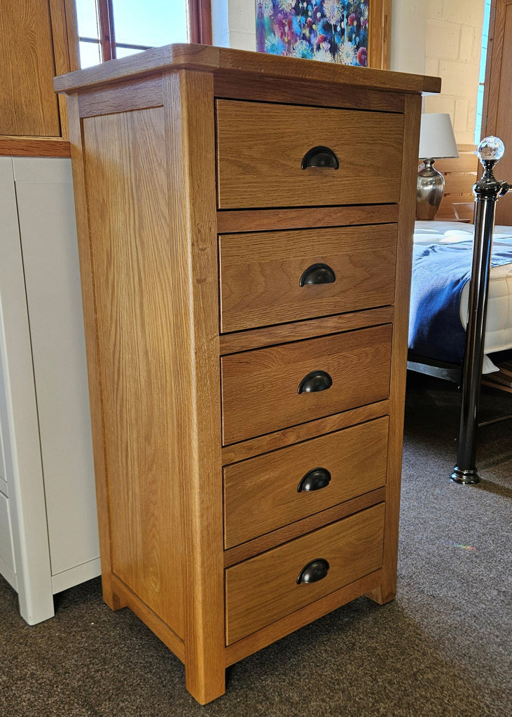 This beautiful collection of furniture will look beautiful in both a traditional or contemporary home. The 5 Drawer Tallboy or Wellington Chest is in Oak with Bronze Handles.