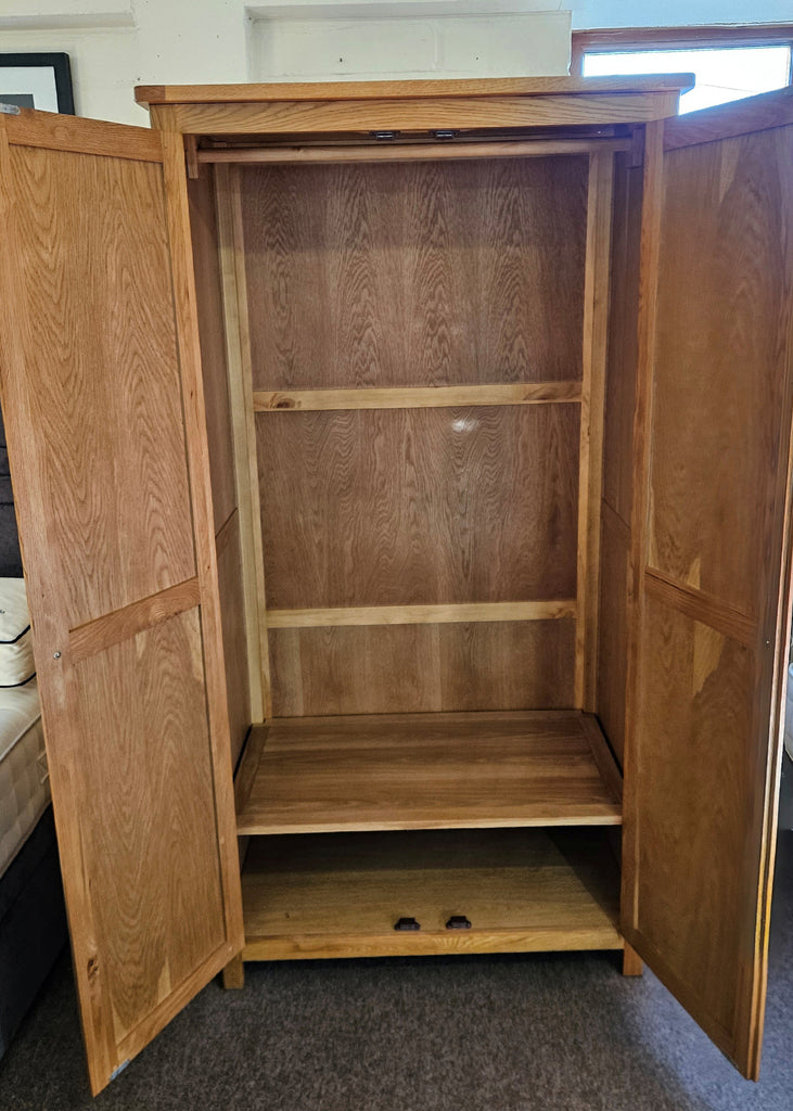 This beautiful collection of furniture will look beautiful in both a traditional or contemporary home. The 2 Door Wardrobe is in Oak with Bronze Handles.