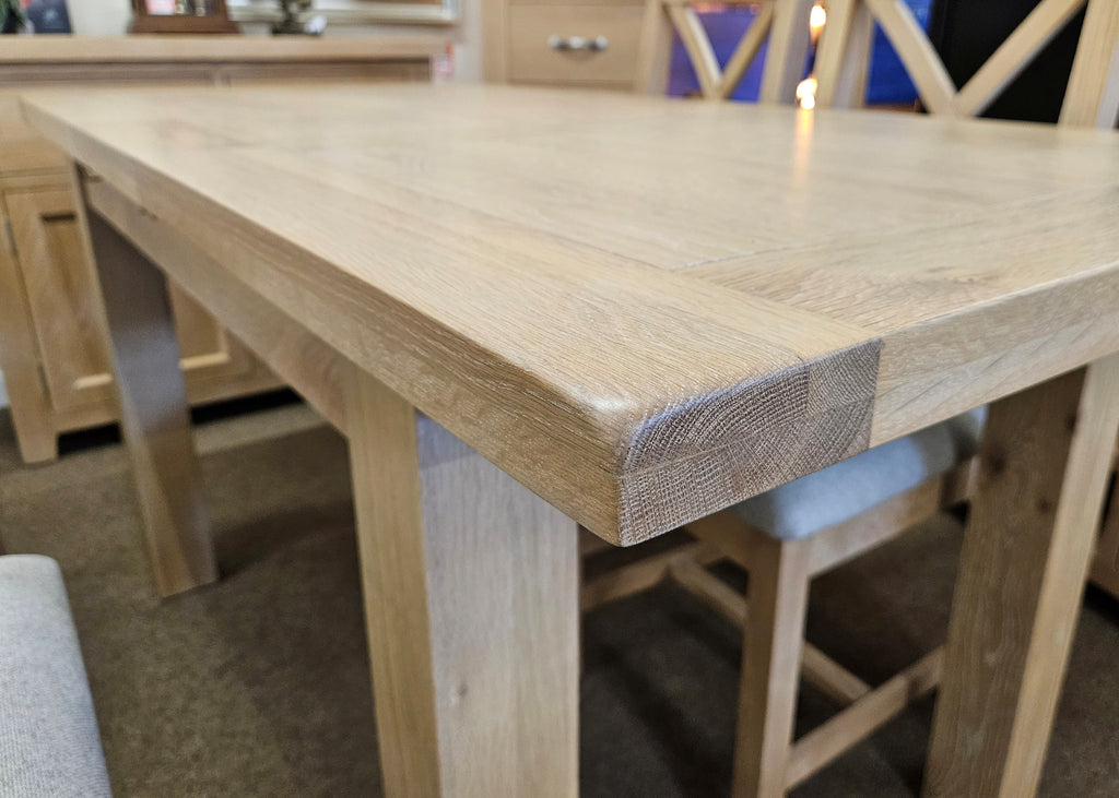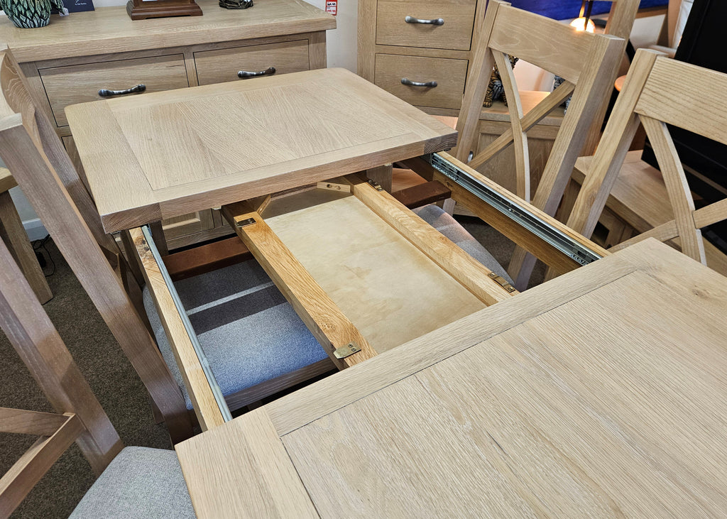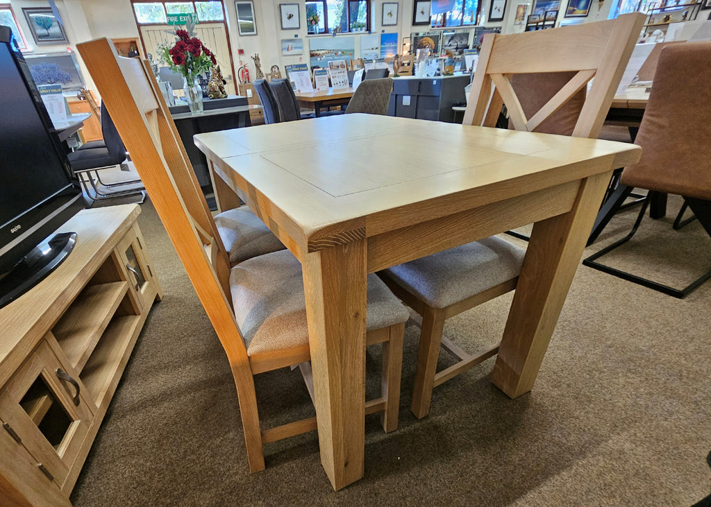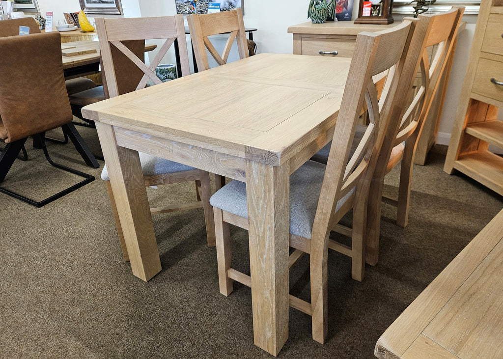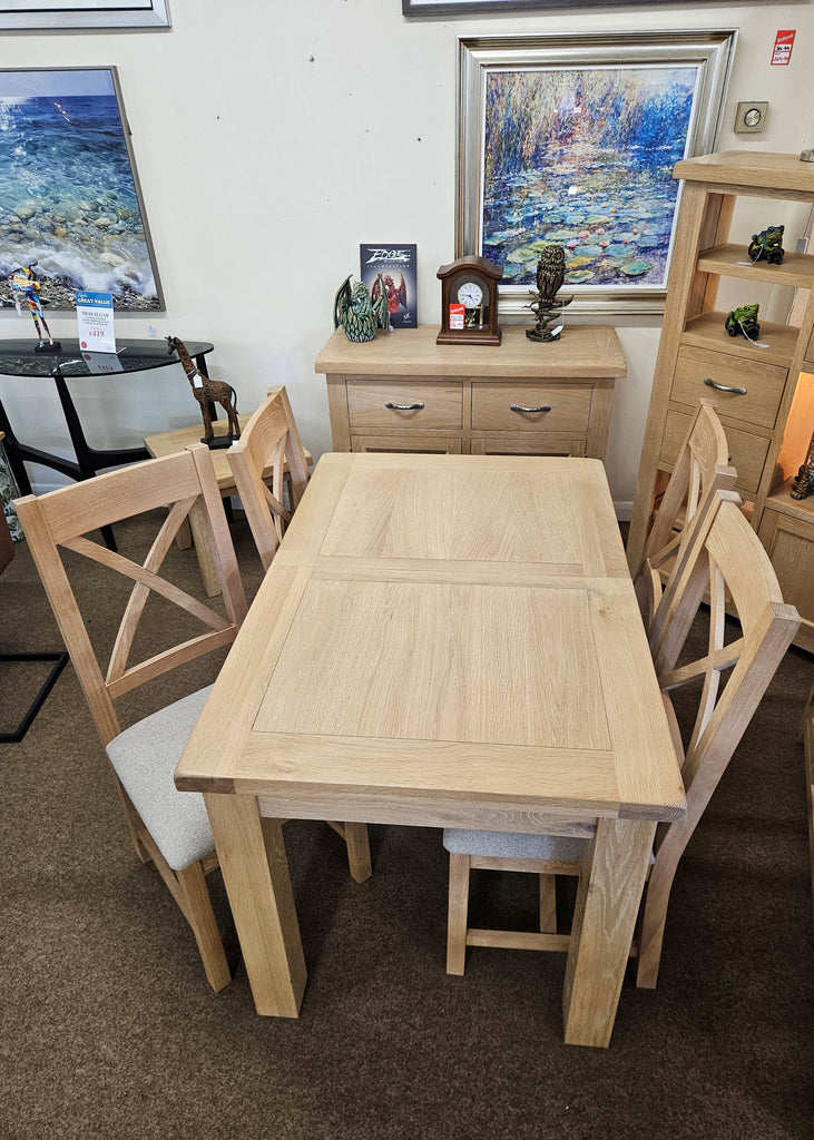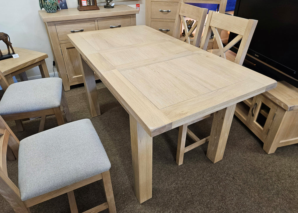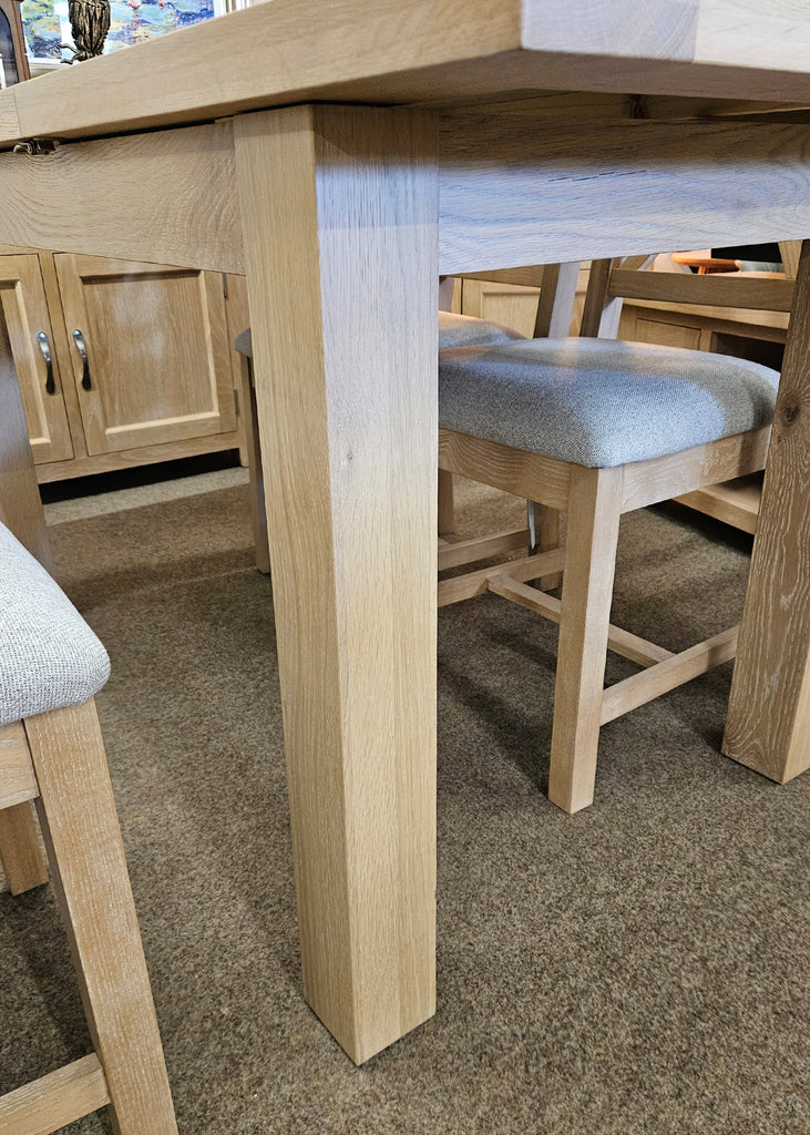 The Avebury Extending Dining Table and 4 Chairs have a contemporary design and a chunky feel. Made in a beautiful pale oak, creating a lovely sense of light and elegance.