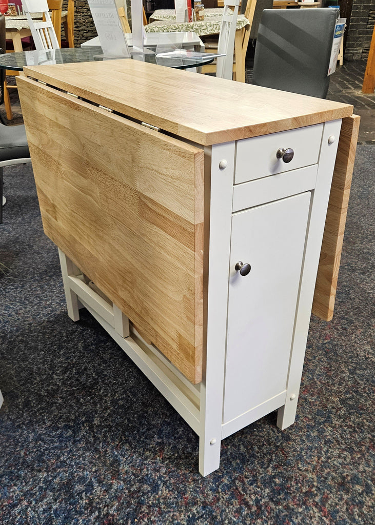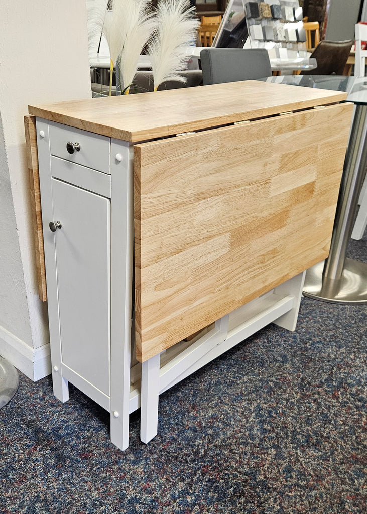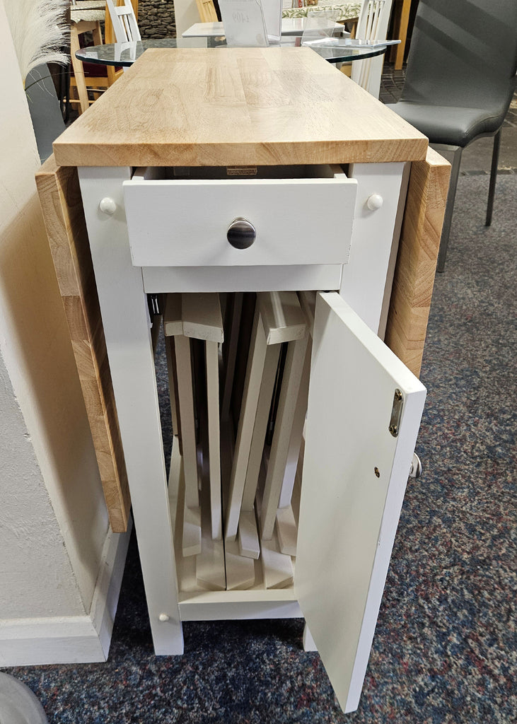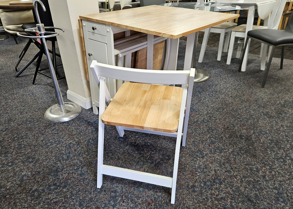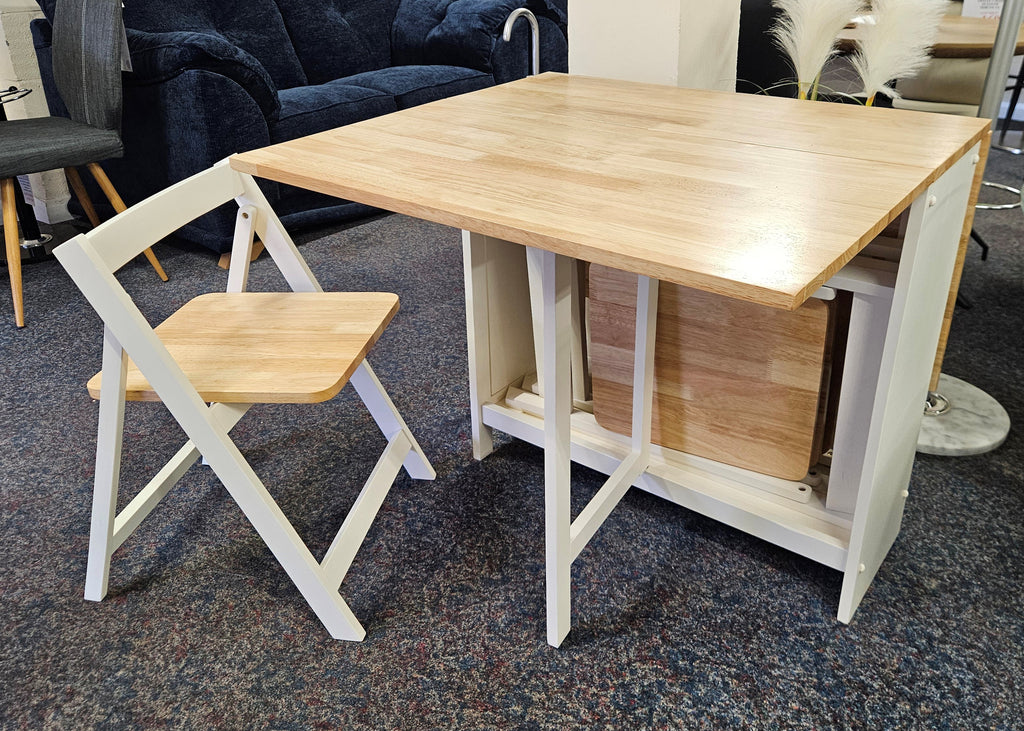 A neat and functional, space saving dining set where the chairs can be folded and stored Inside the table. This dining set is a timeless classic that features a integrated storage drawer, perfect for small spaces with less storage. In a white and natural finish.