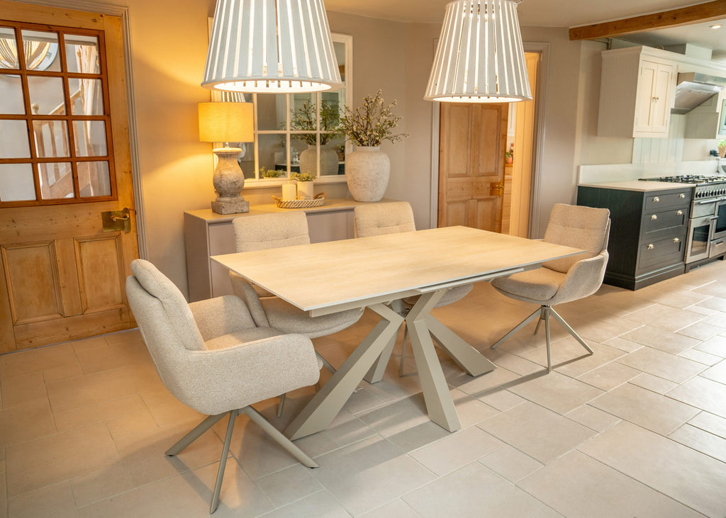 Designed with contemporary living in mind, the Norway Dining Table brings clean lines, practical features, and refined style to your home. Its sleek rectangular shape is enhanced by a centre-opening extension, allowing you to expand the table with ease—ideal for entertaining or simply creating more space when you need it. The table can easily accommodate 4, 6 or 8 people on the stylish Joanna swivel chairs.