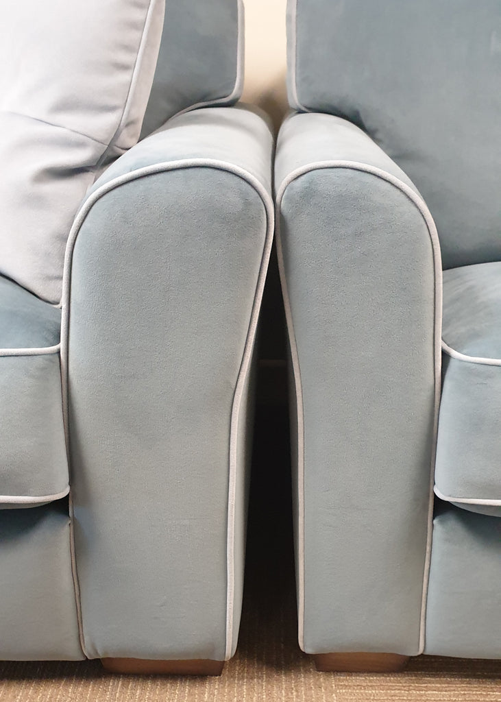 Velvet is a wonderful fabric but this slightest touch will quickly cause it to change appearance and alter the direction of the fabric pile, this is completely normal. In order to keep a uniformed look on Velvet, use a new, clean and dry sponge to “wipe” the pile in one direction across the surface area.