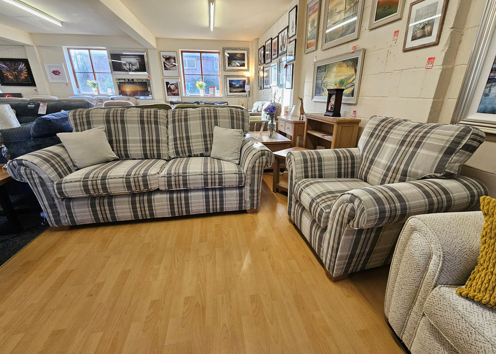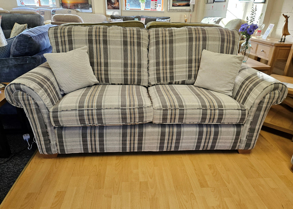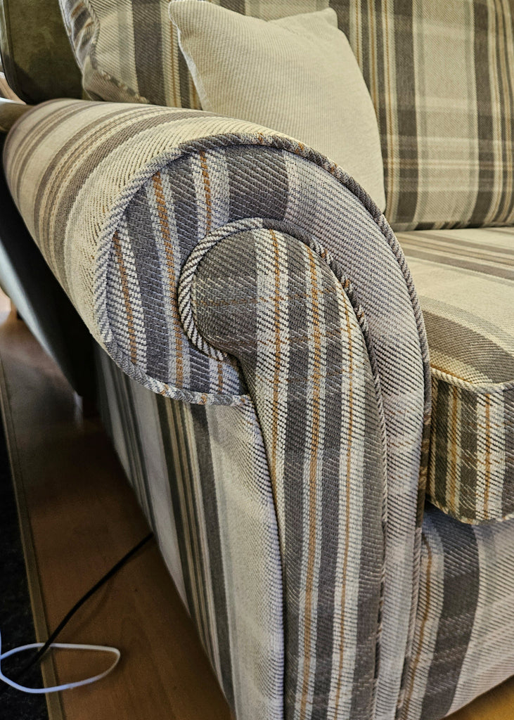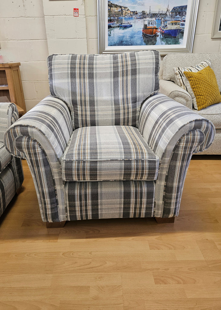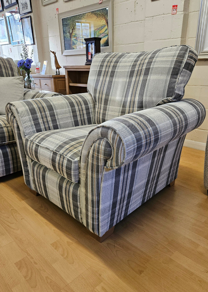 The Lancashire 3 Seater and Armchair has a casually classic scroll arm design with a sharp tailored finish. The proportions are generous with perfectly curved lines and a high back for supreme levels of comfort. Hand finished light wood feet work beautifully with the Mint Grey Wallace Plaid Fabric.