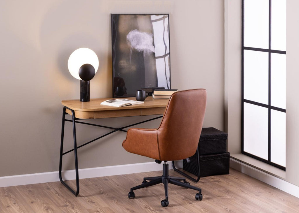 Create an inspiring space with the Erik Office Chair in faux leather finish. The swivel chair is in PU retro brandy fabric, it combines classic vintage aesthetics with the practicality of modern design. Its warm brandy-coloured faux leather mimics the luxurious feel of natural leather, while the tufted detailing adds a refined touch, all designed to transform workspaces or library nooks into inviting havens. The Erik also has a 5-star base in matt black rough powder coated steel with gas lift, soft brake castors, swivel and tufting's.