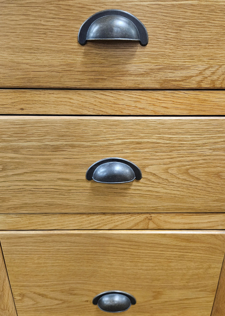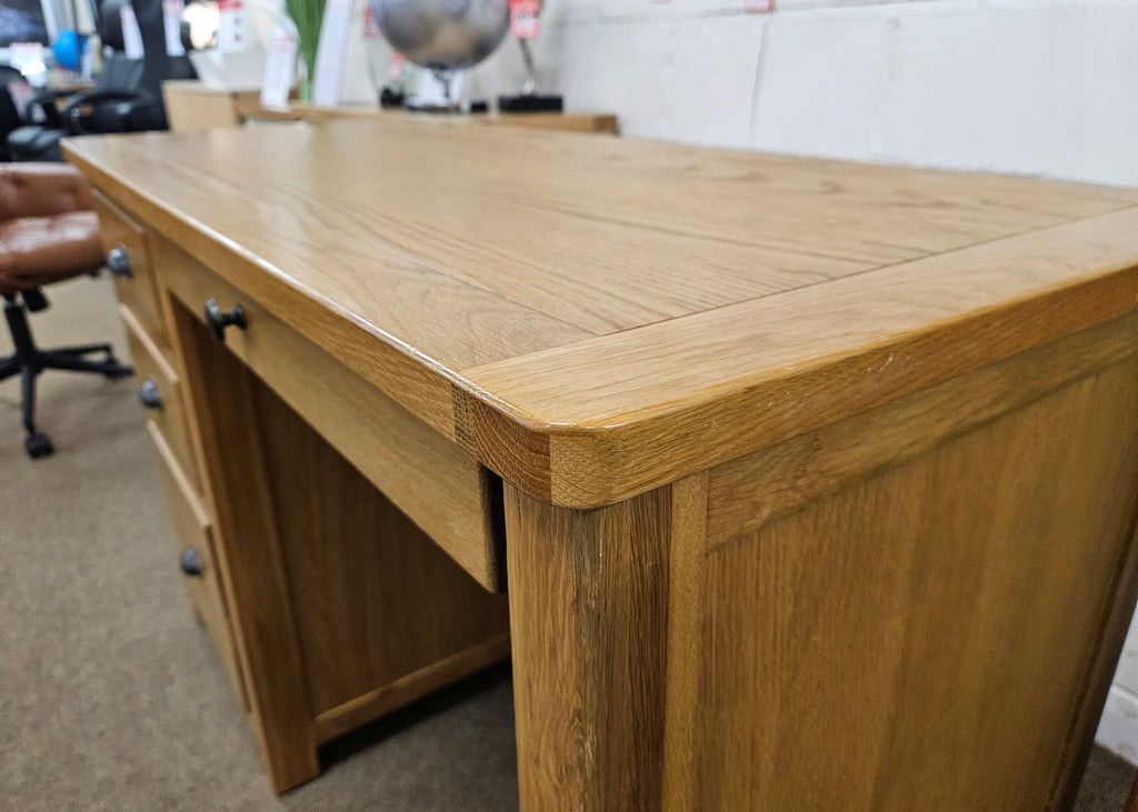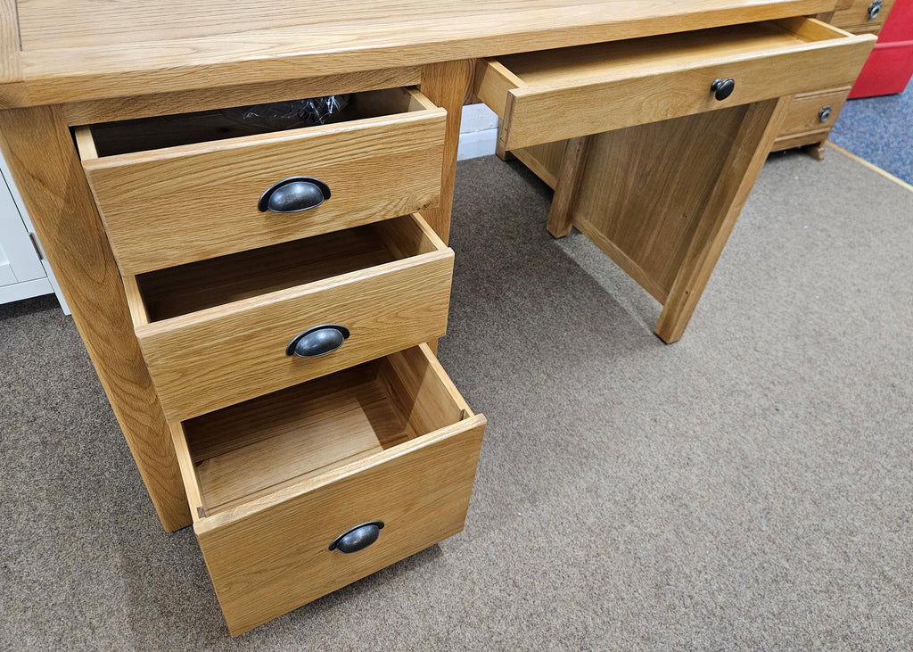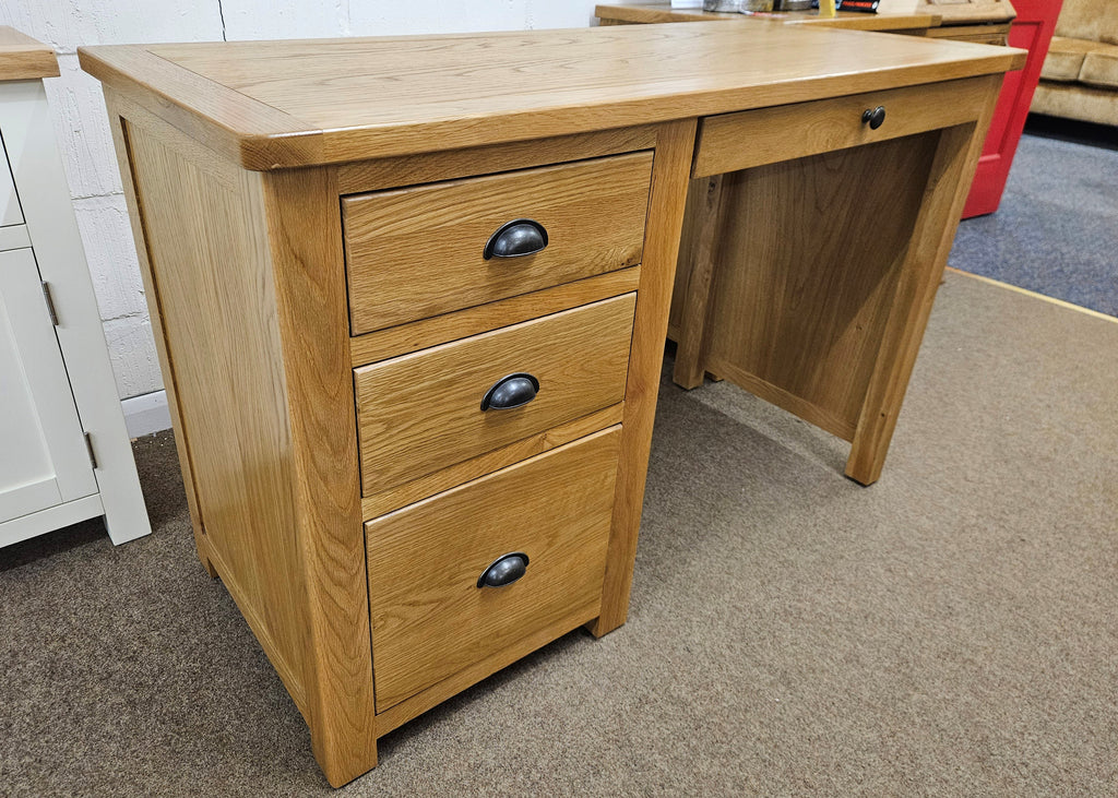 This beautiful collection of furniture will look beautiful in both a traditional or contemporary home. The Single Pedestal Desk is in Oak with Bronze Handles. This would be ideal in an office or a bedroom as a Dressing Table.