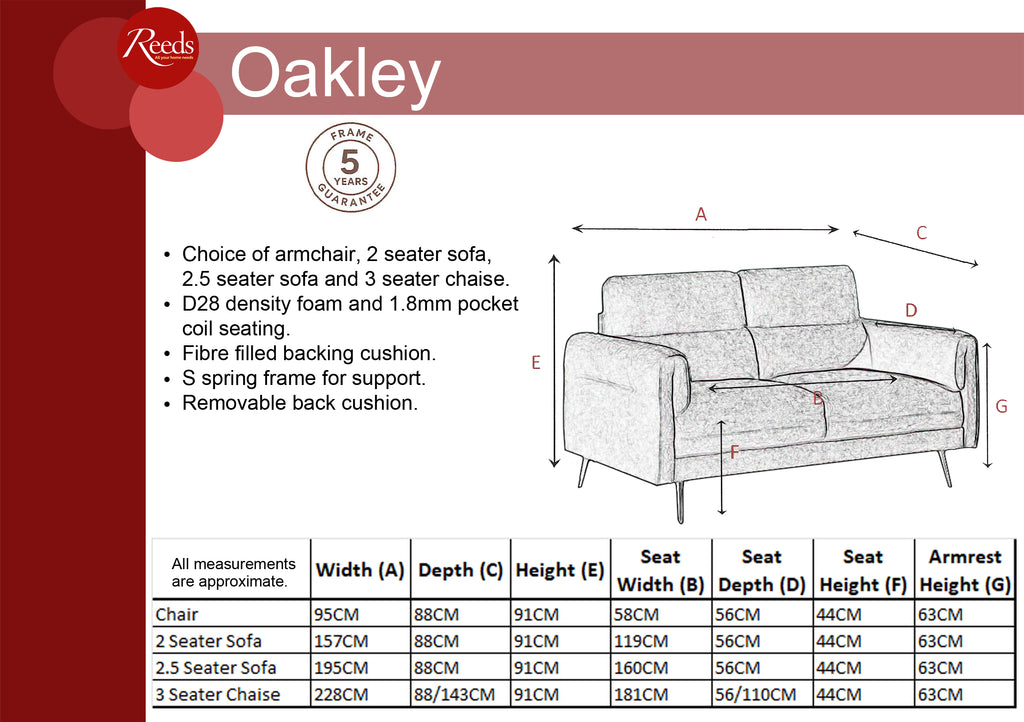 Blending retro charm with modern comfort, the Oakley is a stylish addition to any living space. Upholstered in premium chenille fabric, it features gently curved arms with a fold detail for a refined finish. The fixed design offers medium support through foam and fibre cushions, making it ideal for everyday relaxation. Available in two rich colourways to suit your interior, this sofa brings both character and comfort to your home.